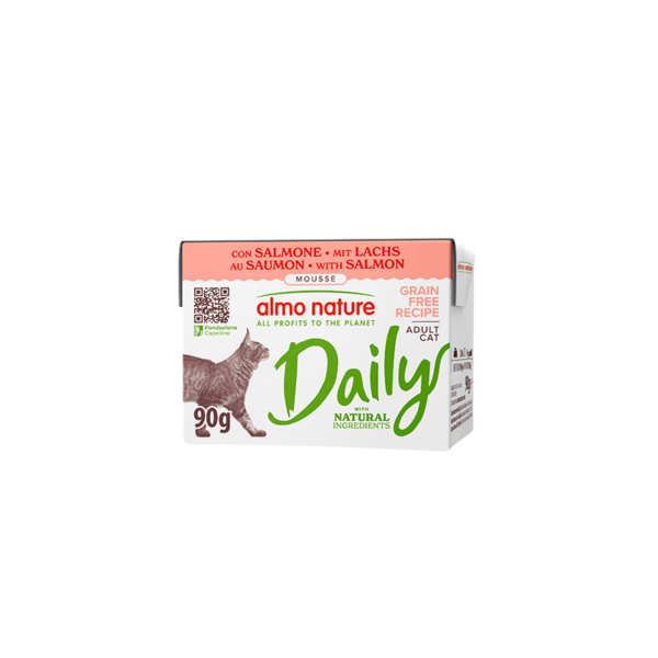 Daily con Salmone 90 g è un alimento umido completo per gatti adulti, preparato con salmone gustoso e ingredienti selezionati per garantire un pasto equilibrato e nutriente. La consistenza morbida e l’elevata appetibilità lo rendono perfetto per l’alimentazione quotidiana, anche per gatti dal palato esigente.