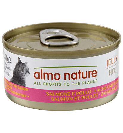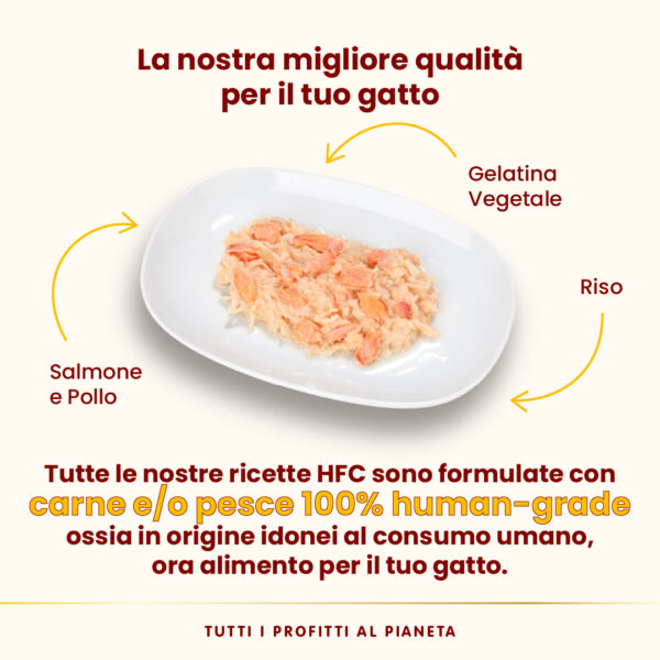 HFC Jelly Salmone e Pollo è un alimento complementare per gatti adulti preparato con ingredienti Human Grade, originariamente idonei al consumo umano.