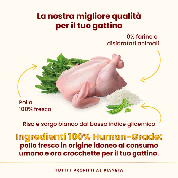 HFC Our Best Kitten Pollo Fresco è un alimento completo e bilanciato pensato per i gattini dai 2 ai 12 mesi. La ricetta utilizza solo pollo fresco Human Grade, cioè carne idonea al consumo umano, garantendo massima qualità e digeribilità.