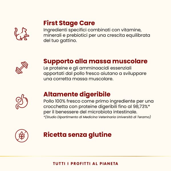 Formulato come monoproteico e gluten free, è ideale per gattini con sensibilità alimentari o difficoltà digestive. L’inclusione di riso, sorgo, lieviti e olio di salmone supporta la crescita, lo sviluppo del sistema neurologico e la salute della pelle e del pelo.