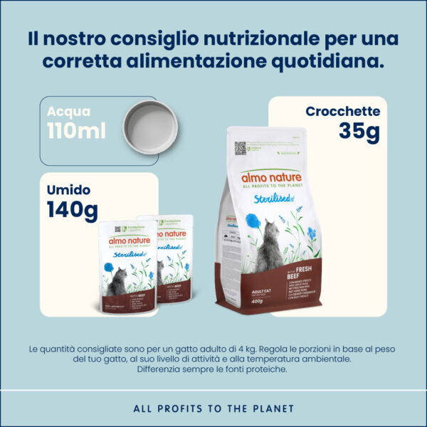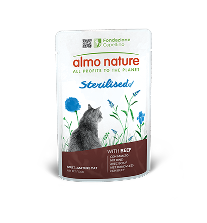 Almo Nature Sterilised con Manzo è un alimento umido completo formulato per i gatti sterilizzati, ideale per supportare il mantenimento del peso e il benessere quotidiano.