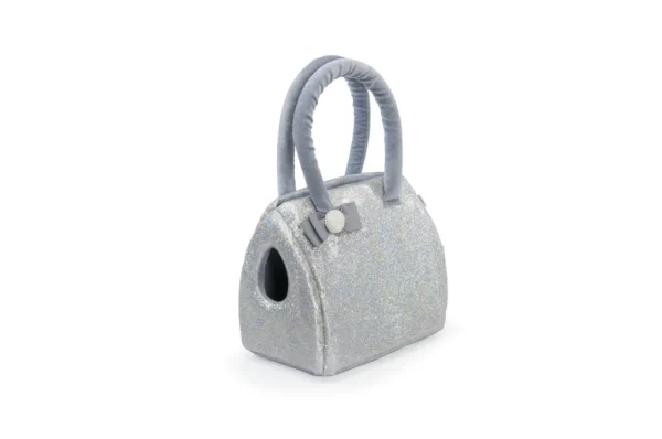 La finitura argentata con glitter aggiunge un tocco di eleganza, mentre l’apertura laterale permette all’animale di guardare fuori durante lo spostamento.