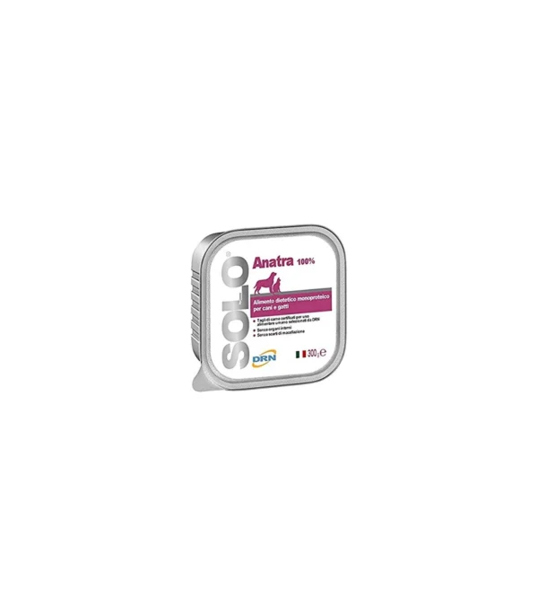 Il DRN Solo Anatra 300 g è un alimento umido monoproteico realizzato con 100% carne di anatra, ideale per cani e gatti con sensibilità alimentari o per chi desidera variare le proteine nella dieta del proprio animale.