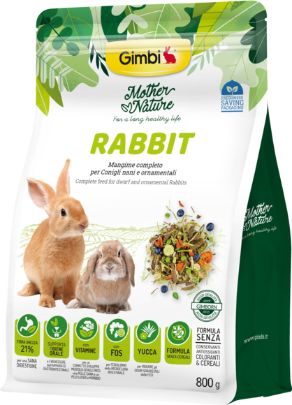 GIMBI GIMBI Mother Nature Rabbit è un alimento completo e bilanciato per conigli adulti, formulato per soddisfare pienamente i fabbisogni nutrizionali quotidiani rispettando la loro natura erbivora.
