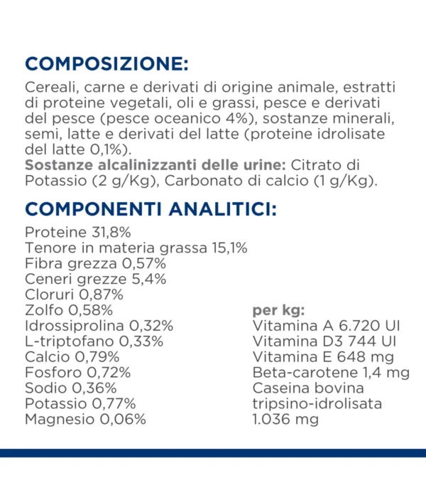 La ricetta contiene ingredienti di alta qualità a base di pesce, formulati per aiutare a mantenere il pH urinario ottimale e ridurre il rischio di cristalli urinari.