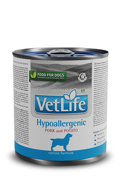 Farmina Vet Life Hypoallergenic Pork & Potato è un alimento dietetico completo per cani, specificamente formulato per la riduzione delle intolleranze a ingredienti e sostanze nutritive e per supportare la funzione dermica in caso di dermatosi o eccessiva perdita di pelo.