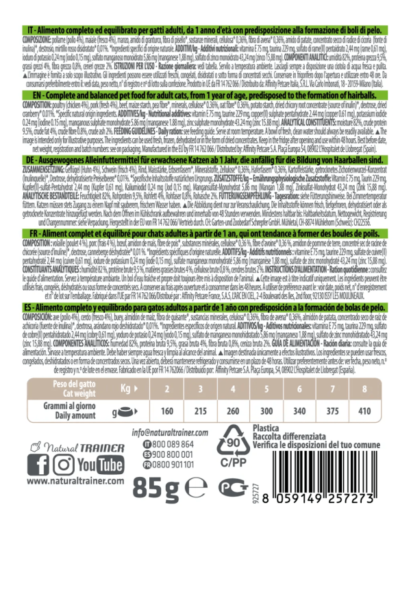 Hairball Adult Pollo è pensato per chi ama prendersi cura del proprio gatto offrendo un cibo buono, sano e che aiuta a prevenire i fastidiosi boli di pelo.