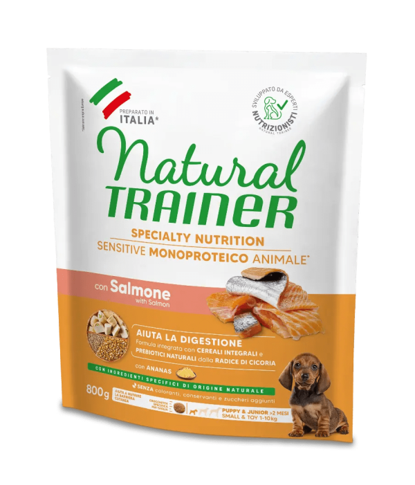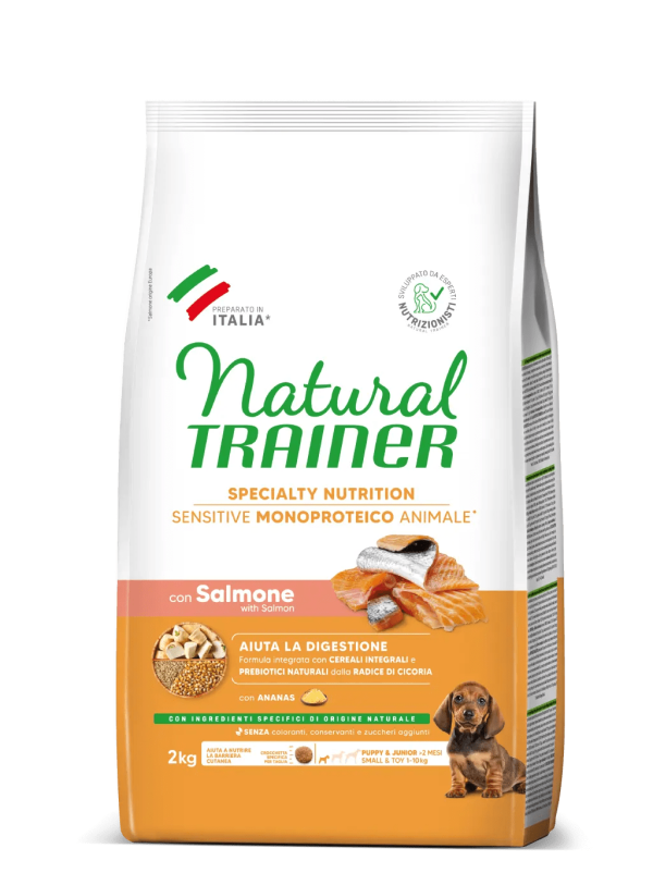 NATURAL TRAINER SPECIALTY NUTRITION SENSITIVE MONOPROTEICO ANIMALE SENZA GLUTINE SMALL&TOY PUPPY&JUNIOR CON SALMONE E CEREALI INTEGRALI