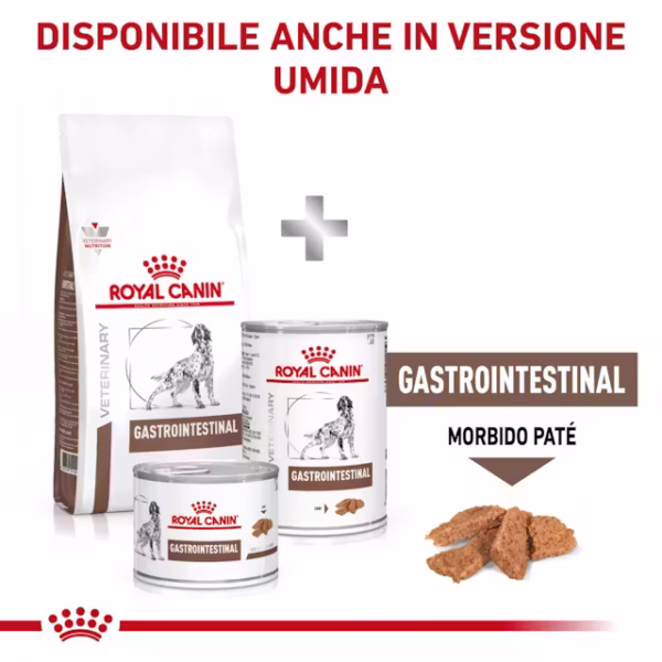 ROYAL CANIN® Gastrointestinal Adult è un alimento dietetico completo formulato per cani adulti con sensibilità gastrointestinale o disturbi digestivi, pensato per promuovere il benessere intestinale e facilitare la digestione.