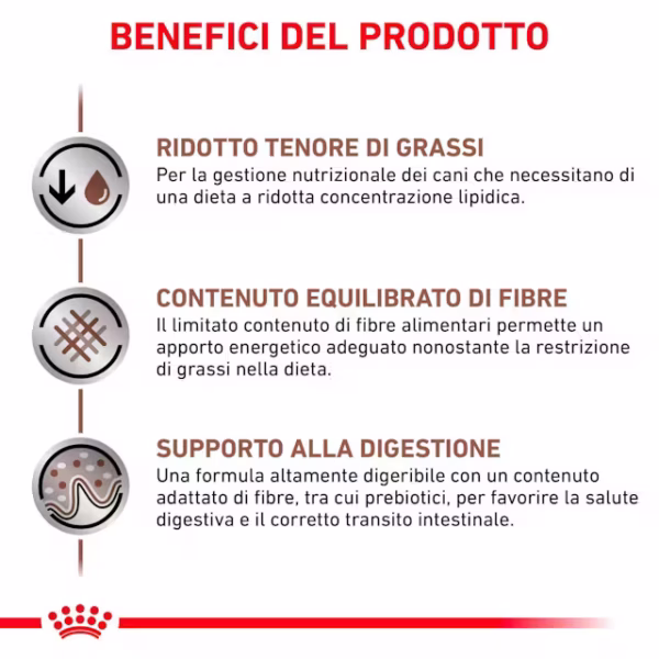 Ideale per la gestione nutrizionale dei cani che necessitano di una dieta a basso contenuto lipidico.