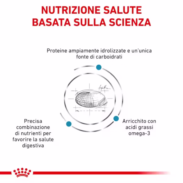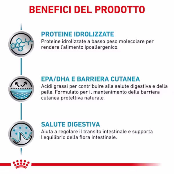 ROYAL CANIN® Hypoallergenic è un alimento dietetico completo progettato per cani adulti con intolleranze o sensibilità alimentari. Contiene proteine idrolizzate a basso peso molecolare e fonti selezionate di carboidrati, riducendo al minimo il rischio di reazioni avverse. La formula supporta la salute della pelle e contribuisce al mantenimento della barriera cutanea naturale.