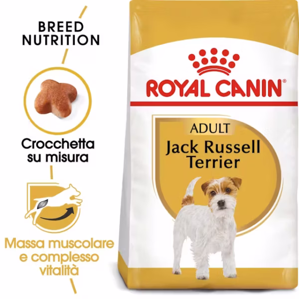 ROYAL CANIN® Jack Russell Terrier Adult è un alimento secco completo e bilanciato, studiato scientificamente per supportare la salute globale del Jack Russell adulto e maturo (a partire dai 10 mesi di età). Ogni crocchetta è progettata in base alle specificità della razza, garantendo un pasto gustoso, nutriente e ideale per il benessere quotidiano.