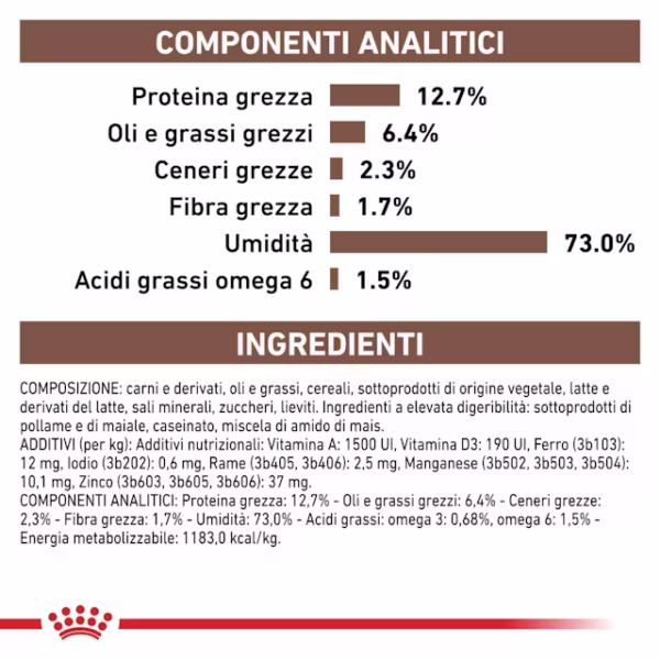 • Può essere utilizzato come pasto unico o miscelato con altri alimenti dietetici ROYAL CANIN® per facilitare la transizione.