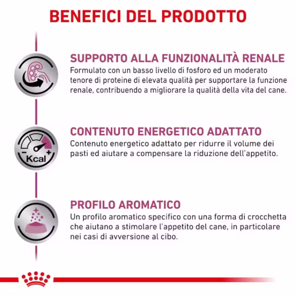 ROYAL CANIN® Renal secco è un alimento dietetico completo specificamente formulato per sostenere la funzione renale nei cani adulti con insufficienza renale cronica. La combinazione di proteine di alta qualità e livelli controllati di fosforo aiuta a preservare la salute renale senza compromettere l’apporto nutrizionale quotidiano.