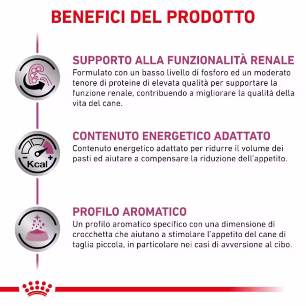 ROYAL CANIN® Renal Small Dog secco è un alimento dietetico completo formulato per sostenere la funzione renale nei cani di piccola taglia con insufficienza renale cronica. Grazie a nutrienti mirati e proteine di alta qualità, aiuta a ridurre il carico sui reni pur mantenendo un’alimentazione equilibrata e completa.