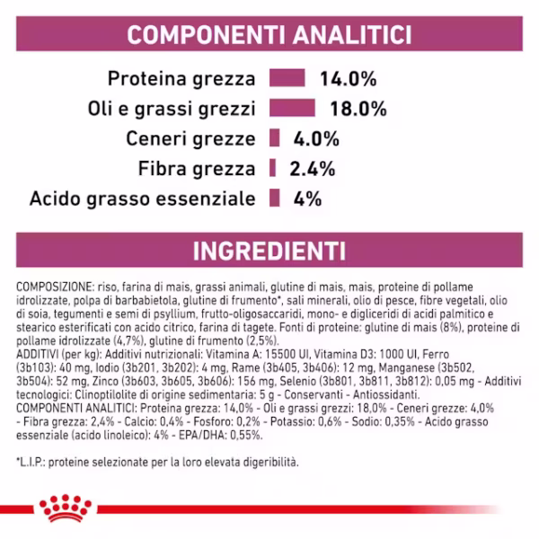 Ridotto contenuto di fosforo e proteine selezionate per alleggerire il lavoro dei reni.