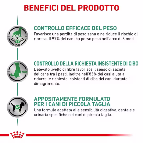 ROYAL CANIN® Satiety Weight Management Small Dog è un alimento dietetico specificamente formulato per cani di piccola taglia che devono ridurre l’eccesso di peso corporeo. Grazie al suo basso potere energetico, aiuta a favorire un dimagrimento efficace e controllato, rispettando le esigenze dei cani piccoli.