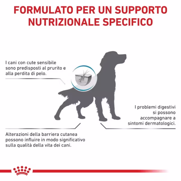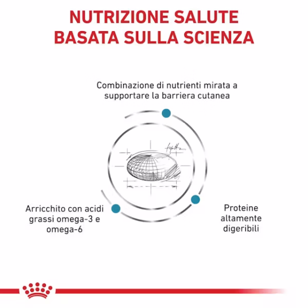 ROYAL CANIN® Skin Care è un alimento dietetico completo formulato per aiutare i cani adulti che soffrono di problemi cutanei, dermatosi, irritazioni o eccessiva perdita del pelo. La sua combinazione di nutrienti altamente mirati sostiene la pelle dall’interno e contribuisce a migliorare il benessere generale del cane.