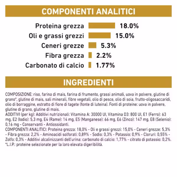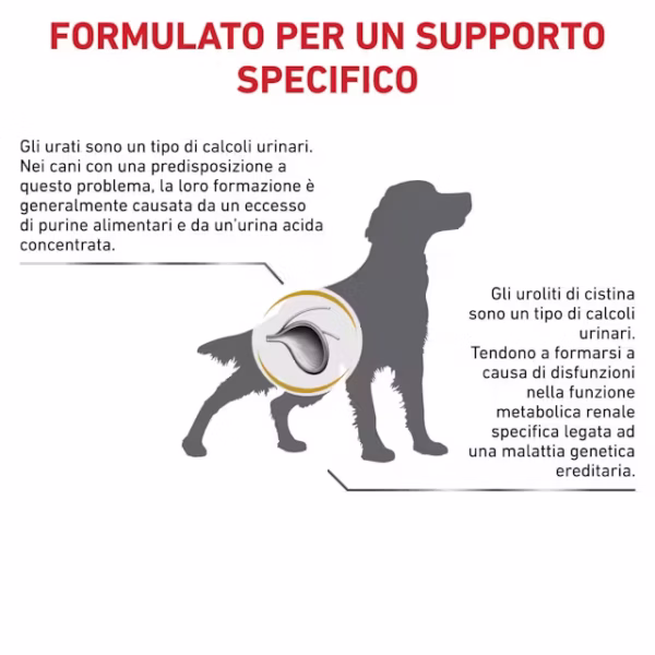 ROYAL CANIN® Urinary U/C è un alimento dietetico completo studiato per sostenere la salute del tratto urinario nei cani adulti. Aiuta a prevenire la formazione di calcoli urinari a base di urati e cistina, supportando anche la salute della pelle e la protezione cellulare.