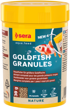 sera Goldfish Granules è un mangime completo in granuli galleggianti formulato specificamente per pesci rossi di grandi dimensioni e per le varietà ornamentali più delicate, come i pesci rossi a pinna a velo, oltre ad altri pesci d’acqua fredda esigenti.