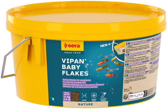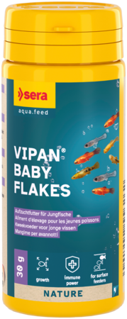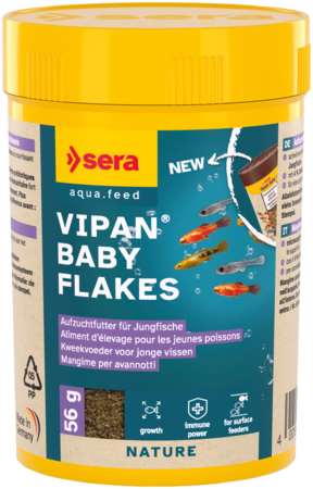 sera Vipan Baby Flakes è un mangime specifico per avannotti e giovani pesci ornamentali che si nutrono in superficie, formulato in microscaglie galleggianti facilmente ingeribili.
